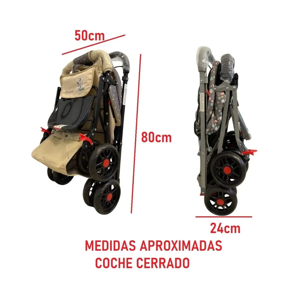 Coche Cuna 3137 Ocho Ruedas todas con freno individual Fácil plegado Ruedas delanteras giratorias Manillar rebatible 3 Posiciones de reclinado Apoya pies regulable Arnés de 3 Ptos. Amplio canasto Capota con diferentes posiciones
