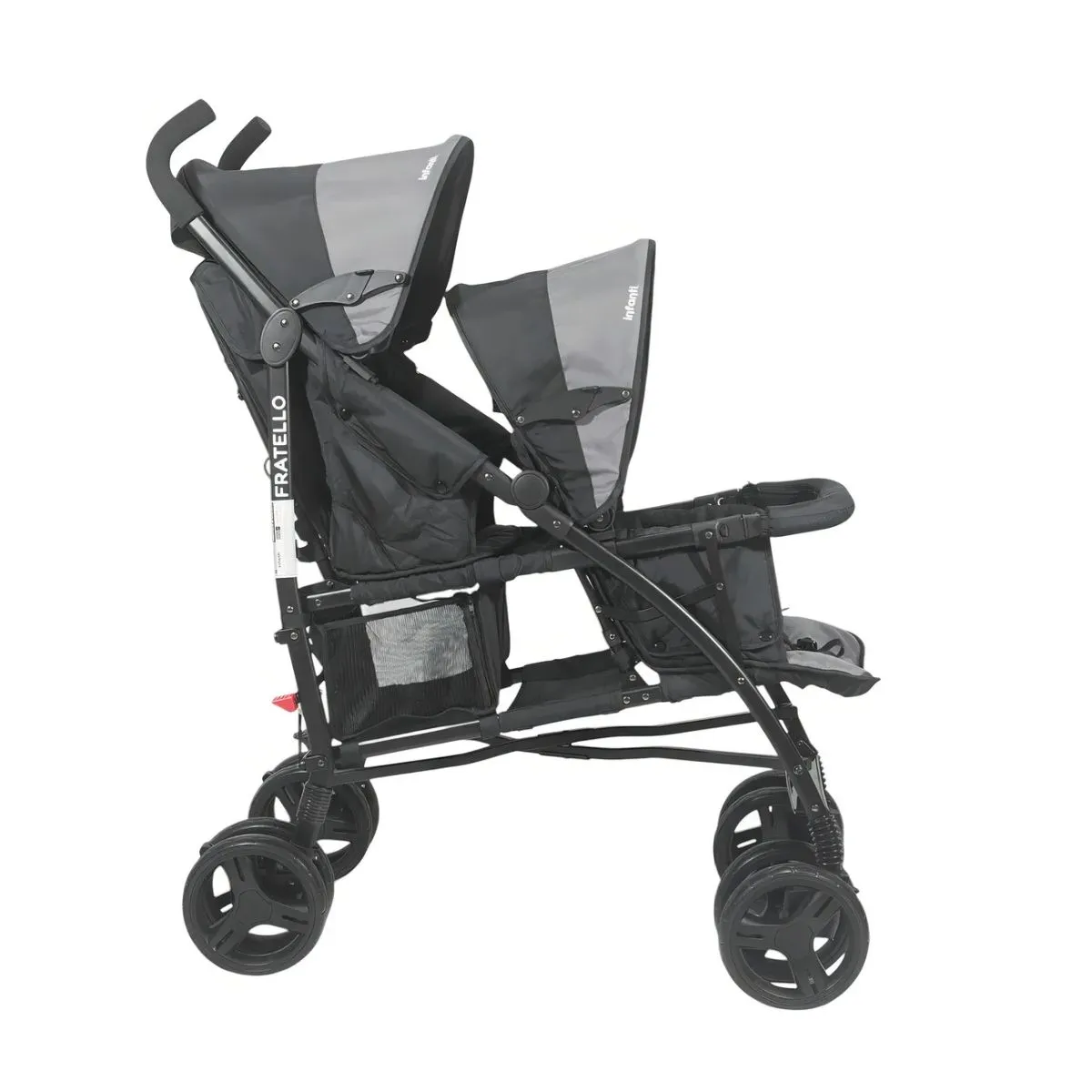 Características: • Apoyabrazos extraíble de uno o ambos lados y forrado con tela removible para su lavado • Arnés de 5 puntas ajustable en 3 alturas y acolchado • Toldos independientes y con visor • Canasta amplia con cierre lateral para un fácil acceso • Asiento delantero para hermano mayor sin reclinación y con apoya pies • Asiento trasero con 3 reclinaciones y apoya pies • Freno en ruedas traseras • Ruedas delanteras giratorias y removibles • Suspensión en sus 4 ruedas • Fácil de plegar • Al plegar abrir cierre del toldo delantero y mover toldo hacia adelante