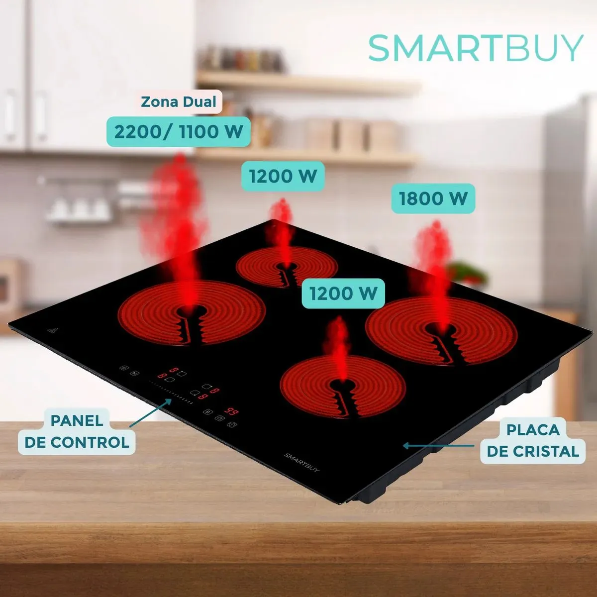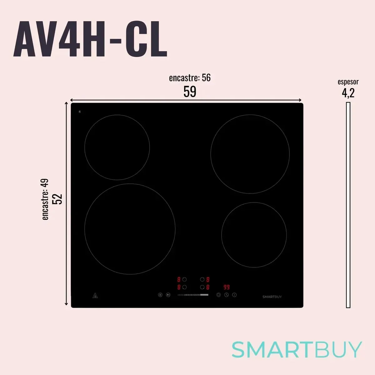 Anafe Vitrocerámico de 4 Hornallas Smartbuy AV4H-CL Características: - Placa vitrocerámica 60cm 4 zonas-6400W - Control táctil-deslizador - Zona dual - 9 niveles de configuración de potencia - Temporizador individual-99 minutos - Función Stop & Go (Pausa) - Indicador de calor residual - Bloqueo para niños - Protección contra sobrecalentamiento y desbordamiento - Apagado Automático de Seguridad - Vidrio cerámico chino de calidad. - Cable de alimentación de 1,0M sin enchufe - Voltaje/Frecuencia: 220-240V~, 50/60HZ - Potencia máxima: 6400W - Potencia de la zona frontal izquierda: Zona dual: 230/138 mm, 2200/1100 w - Potencia de la zona trasera izquierda: 165 mm, 1200 w - Potencia de la zona trasera derecha: 200 mm, 1800 w - Potencia de la zona frontal derecha: 165 mm, 1200 w - Dimensiones del producto (ancho x profundidad x alto): 590*520*51 mm - Dimensiones de corte (ancho x profundidad): 560 x 490 mm