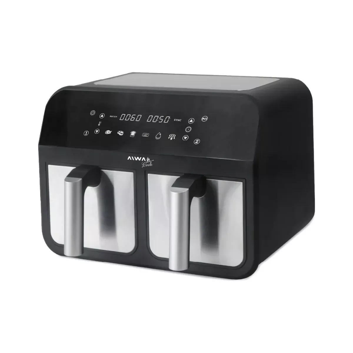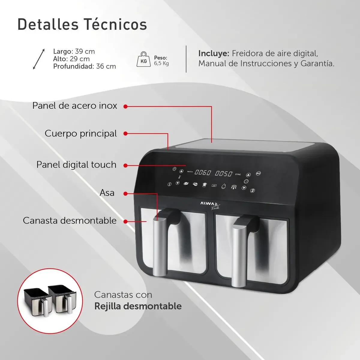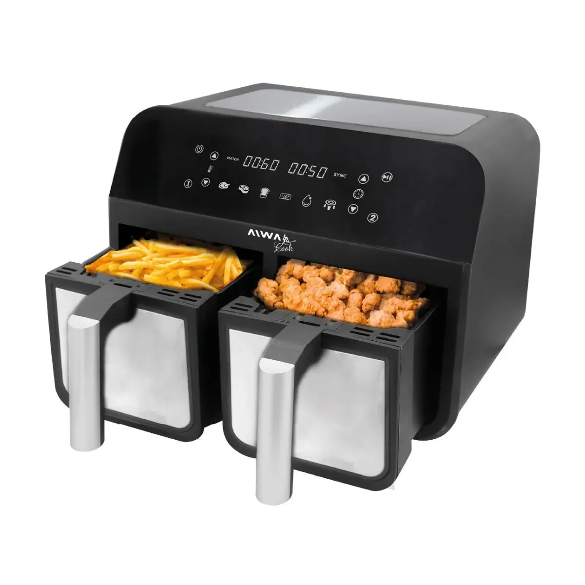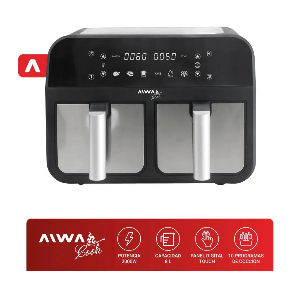 Freidora de Aire Digital Aiwa AW-FA244 Doble Canasto 4 + 4 Litros 2600W 200°C Panel Táctil 6 Programas Temporizador Súper fácil y casero La freidora de aire de 4L + 4L y 2600 W es potente y versátil. Reduce el uso de aceite un 85% para una alimentación saludable y facilita la limpieza. Ideal para preparar una variedad de alimentos y recalentarlos rápidamente, manteniendo su textura y sabor originales. Potencia y capacidad Con 2600W de potencia y una capacidad total de 8 litros divididos en dos canastas de 4 litros cada una, esta freidora es perfecta para satisfacer incluso los apetitos más grandes. Cociná en simultaneo Con sus dos canastas independientes, puedes cocinar dos platos diferentes simultáneamente, ahorrando tiempo y energía en la cocina. Experimentá cocinando Ya sea que desees freír, hornear, asar, deshidratar, descongelar o simplemente calentar tus platos favoritos, nuestros programas de cocción te permiten lograr resultados perfectos con solo tocar un botón. Panel touch digital Con solo tocar la pantalla, puedes seleccionar fácilmente entre los 6 programas de cocción preestablecidos y ajustar la temperatura y el tiempo según tus preferencias. Además, su pantalla digital proporciona una visualización clara y precisa de todas las configuraciones, facilitando el seguimiento del progreso de tus platos.