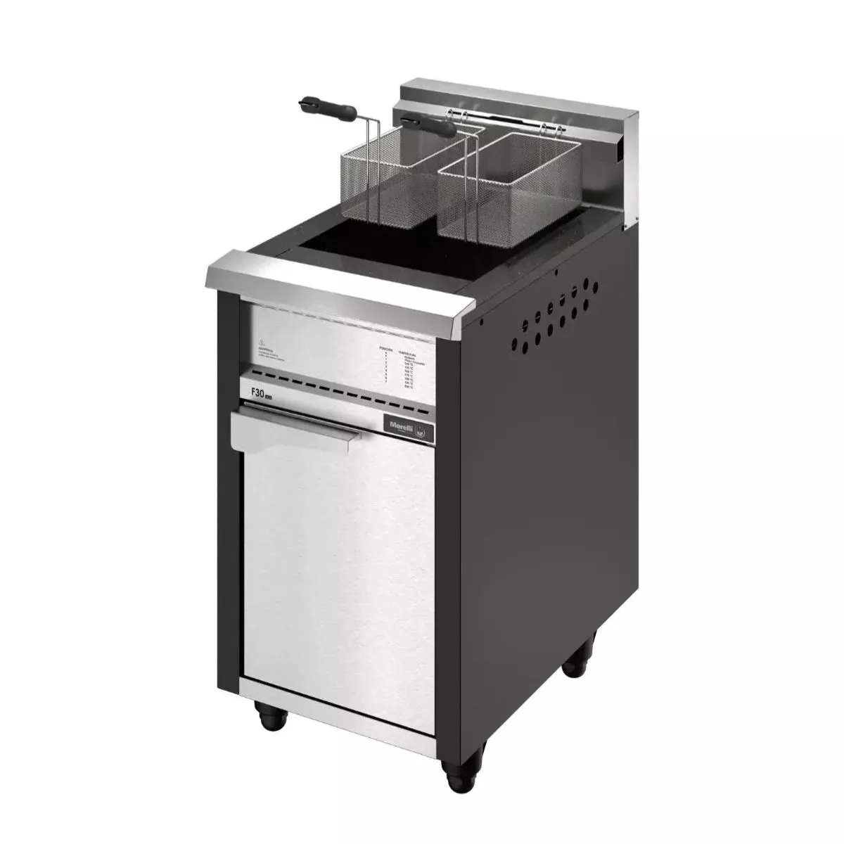 MEDIDAS: Ancho: 52cm Profundidad: 75cm Alto: 90cm (110cm con respaldo). Características del modelo: - Capacidad: 30 Litros - ACEITE y AGUA - VÁLVULA AUTOMÁTICA. Características Generales: Exterior construido en Acero inoxidable esmerilado, control automático de temperatura, tacho enlozado de fácil limpieza, rápida recuperación, no mezcla sabores, 2 canastos porcioneros nequelados, válvula de seguridad, llave escluza de desagote de impurezas