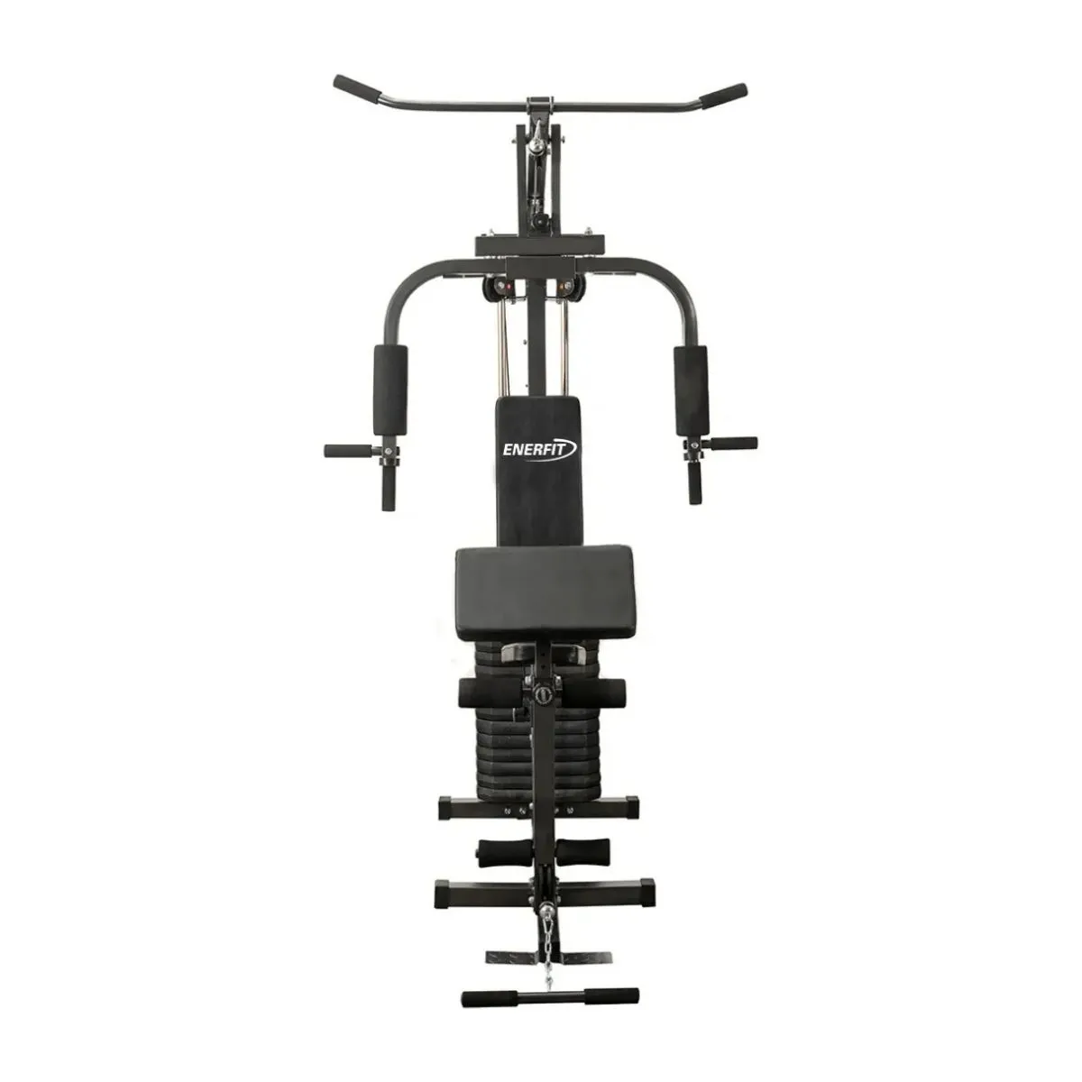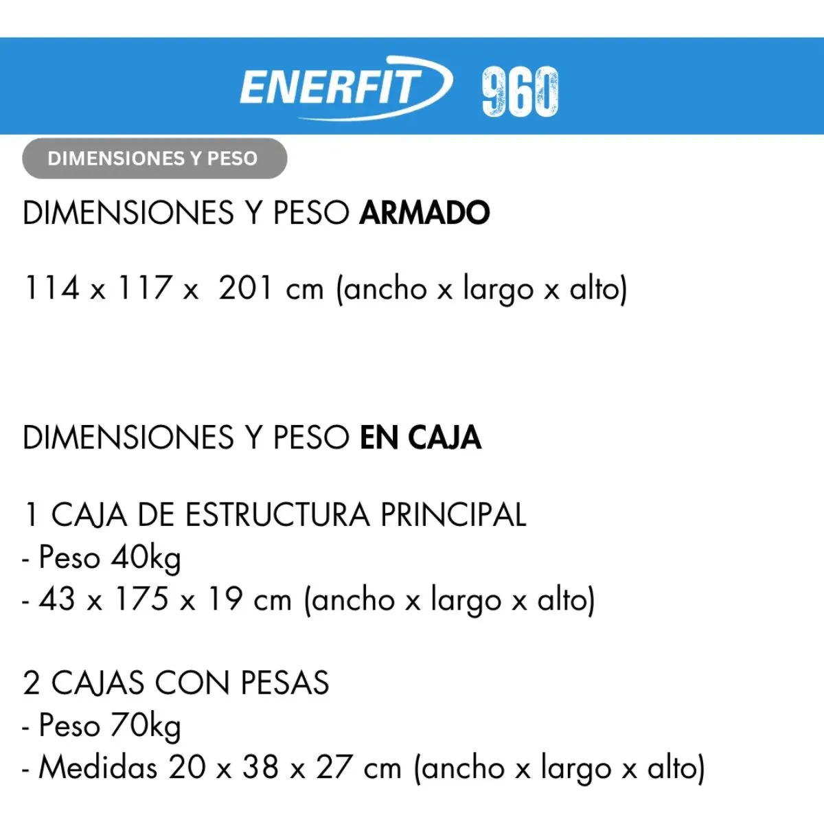 MULTIGIMNASIO ENERFIT 960 - Incluye DORSALES, PECHO MARIPOSA, PECHO PLANO, POLEA ALTA, POLEA BAJA, REMO, TRICEPS, BICEPS, CUADRICEPS, FEMORALES, GLUTEOS. - Incluye barra larga para dominadas y barra corta para biceps, triceps y remo. - 70 kg de lingotes de cemento y granalla metálica recubiertos. - Peso máximo del usuario: 140 kg. - Poleas con ejes de acero y rodamientos reforzados. - Sistema anti-ruido entre las pesas. - Cable de acero reforzado. - Rodillos de alta densidad. - Sistema de clavija para regular el peso de la carga. DIMENSIONES Y PESO ARMADO 114 X 117 X 201 CM DIMENSIONES Y PESO EN CAJA 1 CAJA DE ESTRUCTURA PRINCIPAL - Peso: 40 kg - 43 x 175 x 19 cm (ancho x largo x alto) 2 CAJAS CON PESAS - Peso: 70 kg - Medidas: 20 x 38 x 27 cm (ancho x largo x alto)