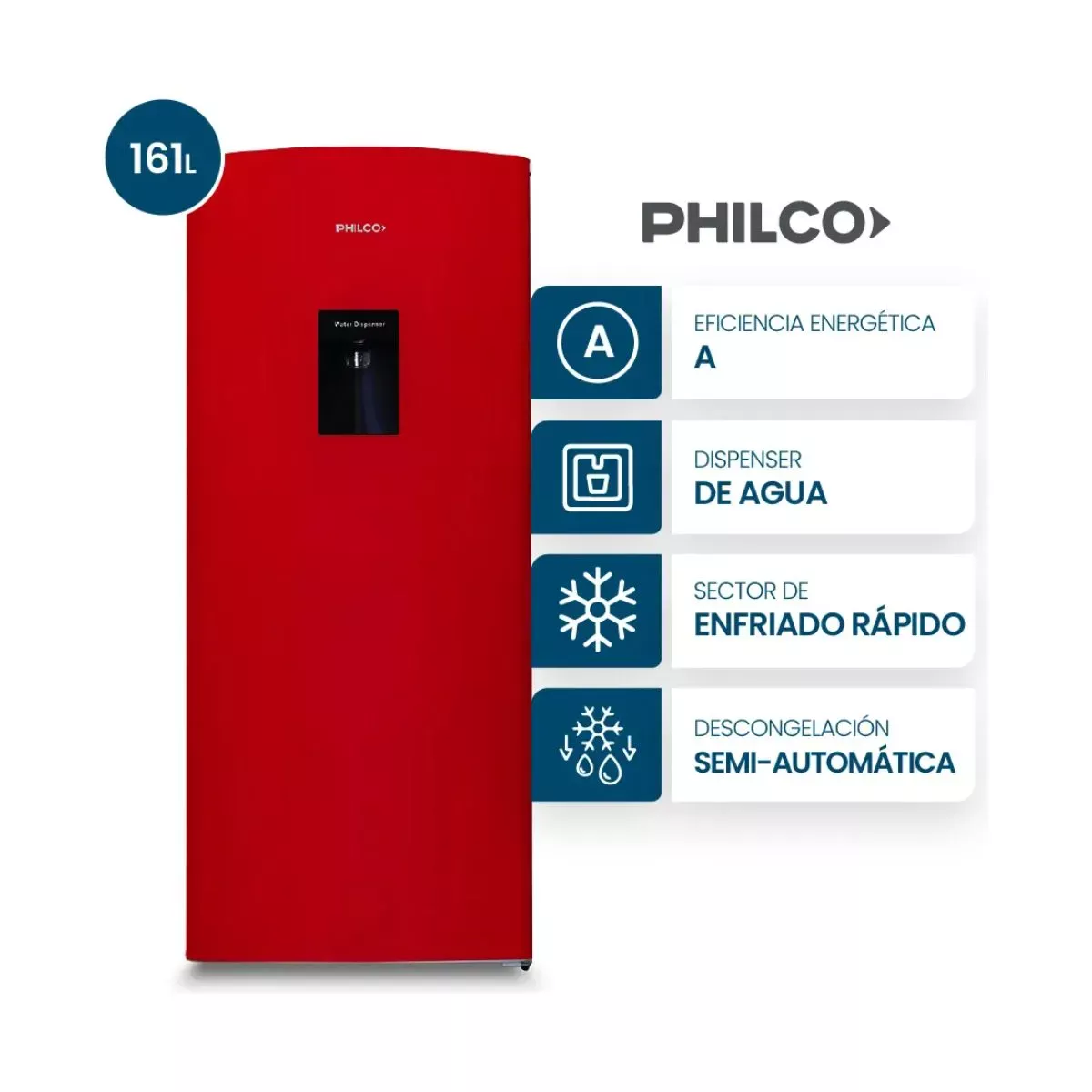 Descubrí una nueva forma de mantener tus alimentos frescos y organizados con la Heladera Philco One Door con Dispenser PHSD179! Su diseño elegante en color rojo se adapta a cualquier cocina moderna, y con su gran capacidad neta de 161 Litros, vas a tener espacio de sobra para todas tus compras semanales. Cuenta con anaqueles especiales para botellas y estantes de vidrio templado que podés ajustar a tu gusto. Con eficiencia energética A, esta heladera es amigable con tu bolsillo y el medio ambiente, asegurando un bajo consumo eléctrico. Además, su práctico dispenser de agua es un plus que te hará la vida más cómoda y fresca. Un compartimiento extra frío es ideal para mantener tus alimentos más delicados en perfecto estado. No pierdas la oportunidad de sumar esta joya a tu hogar. ¡Compralo ahora y disfrutá de los mejores beneficios! Aclaraciones: - Distancias mínimas de posicionamiento: 50mm de espacio entre la parte trasera y laterales de la heladera, y al menos 100mm de espacio desde la superficie. Apertura de puertas de 140° .