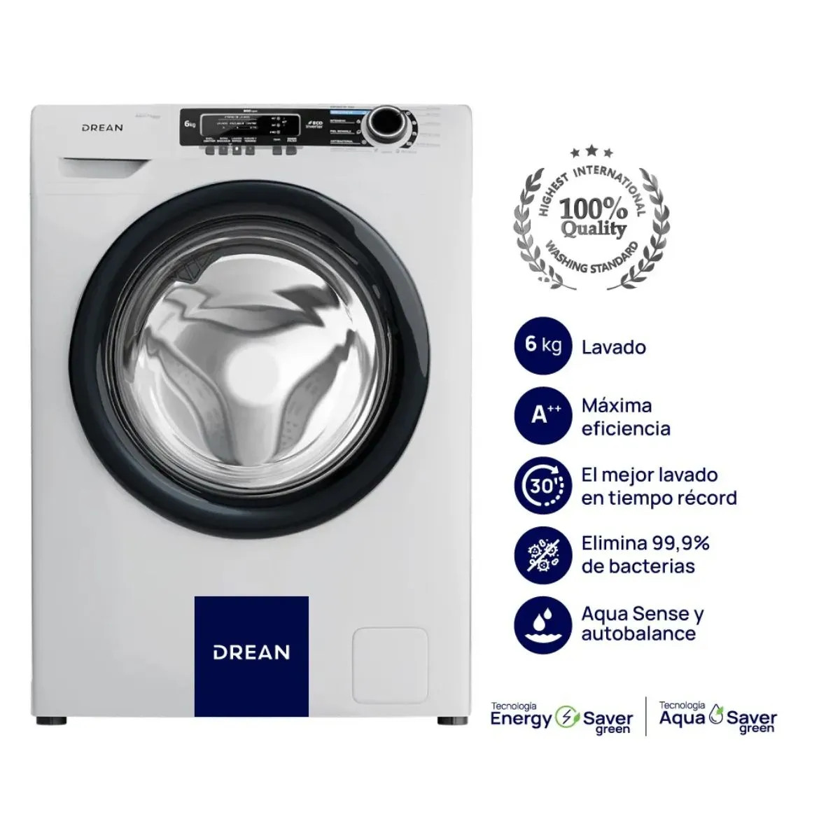 Kg 6 RPM 800 MOTOR INVERTER **Principales características** Cúpula Plástico Color Aro Adorno Puerta Negro Domo NO Aplique NO Wifi NO **Panel de Control** Controles Perilla retroiluminada Perilla # Opciones de ciclo 13 Ciclos + Apagado Ciclos automáticos 13 Algodón sí Delicada sí Deportiva sí Ropa de cama sí Súper Intensivo EEE sí Enjuaga sí Centrifugado sí Limpieza Tambor sí Antibacterial sí Piel Sensible sí Intensivo sí ECO Diario 45' sí Rápido 30' Pro sí Diagnóstico - **Funciones adicionales** Selección de RPM de Centrifugado - Extra Enjuague sí Lavado rápido sí Vuelvo y termino sí Fin diferido - Selector de temperatura sí Inicio / Pausa sí Exclusión de Centrifugado sí Enjuague tibio - **Gráficos y Display** Overlay Heat transfer Display LED FULL Colores General Blanco Display Azul Botones Gris oscuro Luz Botones Blanco Perilla Negro Luz Perilla Blanco **Estándares** IRAM 2141 EE SI Eficiencia Energética A++ IRAM 2092 Seguridad SI **Dimensiones y peso neto (sin embalaje)** Ancho (mm) 595 Profundo (mm) 495 Alto (mm) 855 Peso (kg) 62,3 **Dimensiones y peso bruto (con embalaje)** Ancho (mm) 640 Profundo (mm) 505 Alto (mm) 890 Peso (kg) 63,9